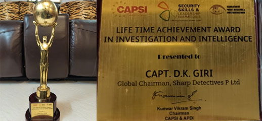 Our "Lineage of Succession" of having 78 years of Experience as a Private Detective and Investigator has passed on “Over the Four Generations” and now lead by Our Global Chairman, Capt. D K Giri, who is presently also, The National President of The Association of Private Detectives in India (APDI) & is also Honored for being The Best Private Detective and Private Investigator of India by, The President of India & also the only one to be Honored with Life Time Achievement Award and many other National & International Awards for Excellence in Detective Services as Private Investigators.